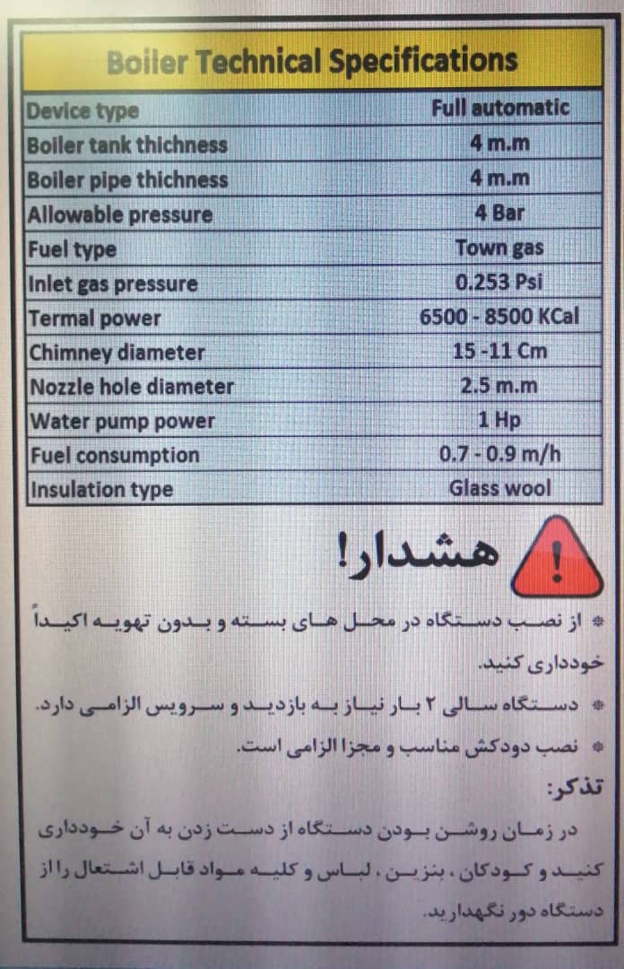 درر نمونه های 60 لیتری به بالا آبگیری خودکار میباشد و مخزن آب و پمپ آب دارد این دستگاه توان تولید ۴ بار(واحد تولید بخار)دارد برای مشاغل مختلف اعم از کارواش ها و سالن های تولید قارچ برای ضدعفونی سالن ها ،نانوایی ها و سایر مشاغل برای تولیدی های پوشاک تامین بخار دسته اتو ها استفاده میشه که طبق جدول زیر توان تولید بخار دارد دیگ ۴۰ برای ۱ تا ۳ اتو دیگ ۶۰ برای ۴ تا ۶ اتو دیگ ۸۰ برای ۶ تا ۸ اتو دیگ ۱۲۰ برای ۸ تا ۱۰ اتو دیگ ۱۵۰ لیتری تا ۱۲ قیمت ها همراه با پمپ آب و مخزن هست اتصالات کامل نیز روی دستگاه هست ورق مخزن دستگاه ۴ میل واقعی میباشد و سایر متعلقات و فشارسنج و پرشر و شیرگاز دارای استاندارد میباشد پرشر فشار دانفوس دارای شیر اطمینان و گیج فشار خدمات پس از فروش یکسال گارانتی با بیش از ۷ سال سابقه تولید دیگ بخار ارسال به سراسر کشور تحویل فوری در مشهد و۲ الی ۵ روزه برای شهرستان ها
