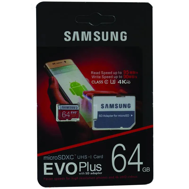 Evo Plus class 10 microSDXC memory card, UHS-I U3 standard, 100MBps speed, 64GB capacity, with SD adapter